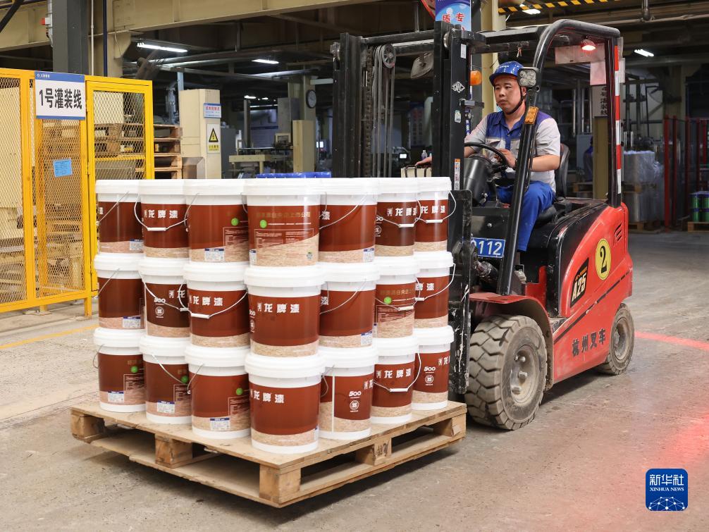 8月19日,工人駕駛叉車在龍牌涂料北京有限公司涿州分公司涂料車間搬運涂料產品。
