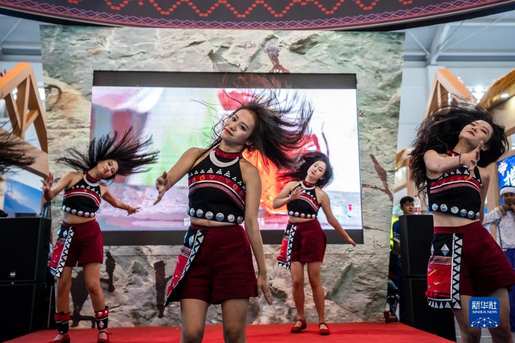 8月18日,第七屆中國—南亞博覽會臨滄展區的演員表演佤族甩發舞。