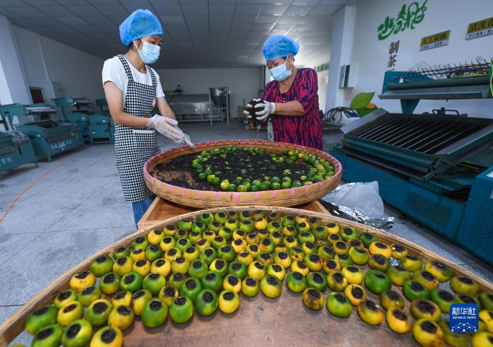 8月20日,在浙江省建德市三都鎮松口村的小青柑共富工坊,工人忙著填充茶葉,將新鮮的小青柑加工制成青柑茶。
