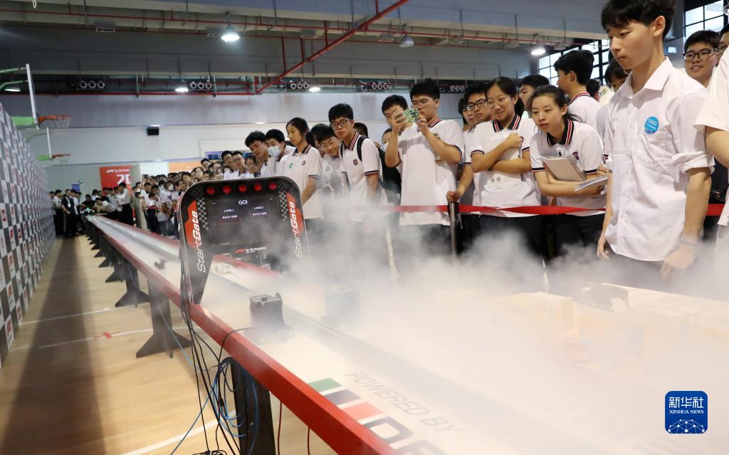 8月20日,同學們在FIS競速賽車賽道邊觀看借助小氣壓瓶助力起跑的賽車。