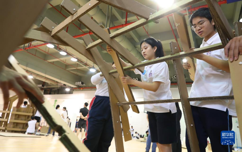8月20日,來自上海市南洋模范中學的學生在學生建造節活動中搭建參賽作品。