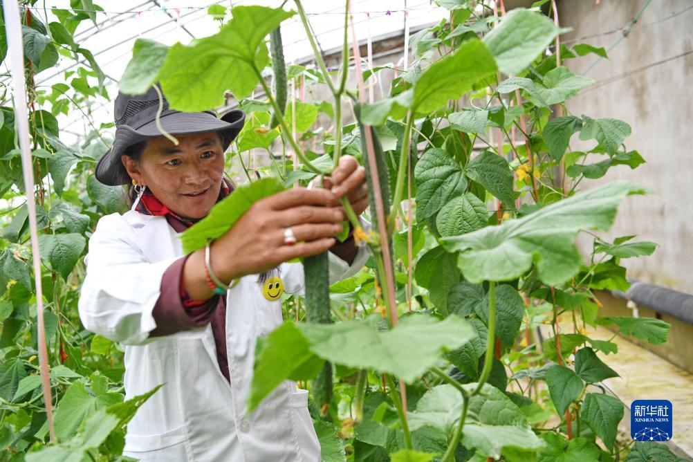措勤縣高原生態畜牧業現代化養殖一體化產業綜合基地合作社社員白瑪在蔬菜大棚采摘黃瓜(8月19日攝)。