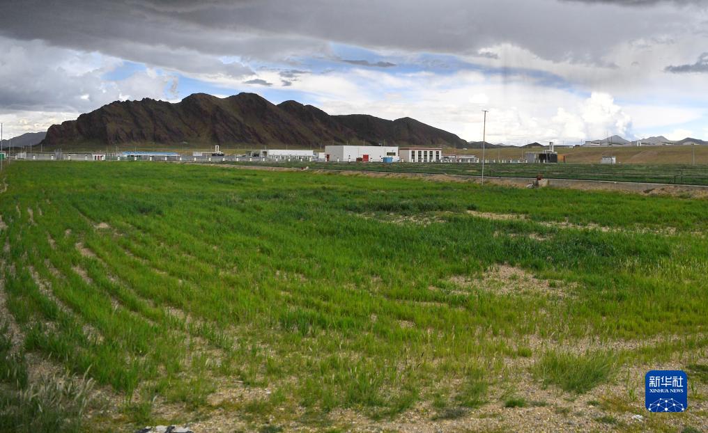 措勤縣高原生態畜牧業現代化養殖一體化產業綜合基地合作社人工草場和遠處的產業園區廠房(8月19日攝)。