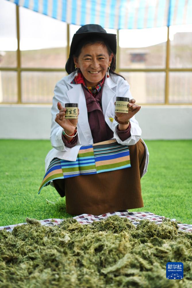 措勤縣高原生態畜牧業現代化養殖一體化產業綜合基地合作社社員展示產業園區特產——野蔥調味品(8月19日攝)。