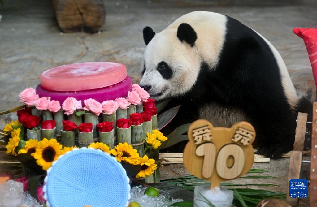 當日,位于??谑械暮D蠠釒б吧鷦又参飯@為園內大熊貓“貢貢”和“舜舜”舉行10歲生日慶?;顒?。工作人員用冰塊、竹筍、水果等制作生日大餐,為它們慶生。