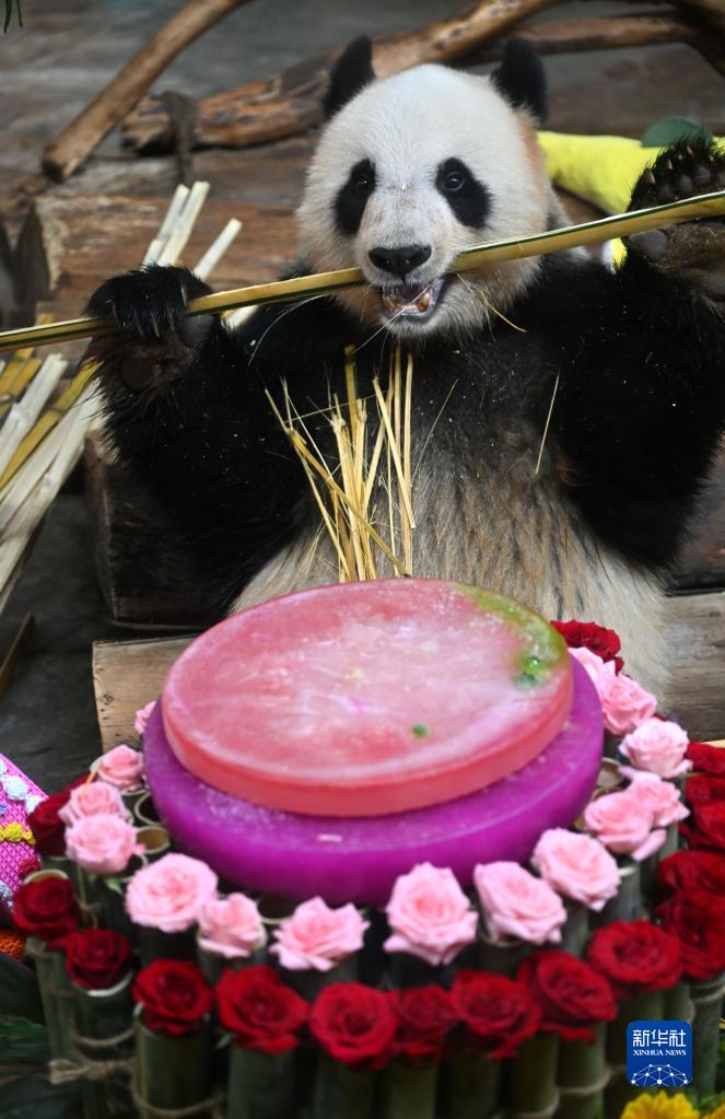 當日,位于??谑械暮D蠠釒б吧鷦又参飯@為園內大熊貓“貢貢”和“舜舜”舉行10歲生日慶?;顒?。工作人員用冰塊、竹筍、水果等制作生日大餐,為它們慶生。