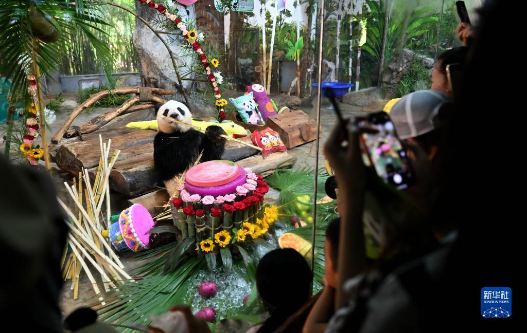 當日,位于??谑械暮D蠠釒б吧鷦又参飯@為園內大熊貓“貢貢”和“舜舜”舉行10歲生日慶?;顒?。工作人員用冰塊、竹筍、水果等制作生日大餐,為它們慶生。