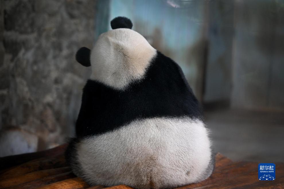 8月20日,大熊貓“舜舜”背對觀眾品嘗美食。