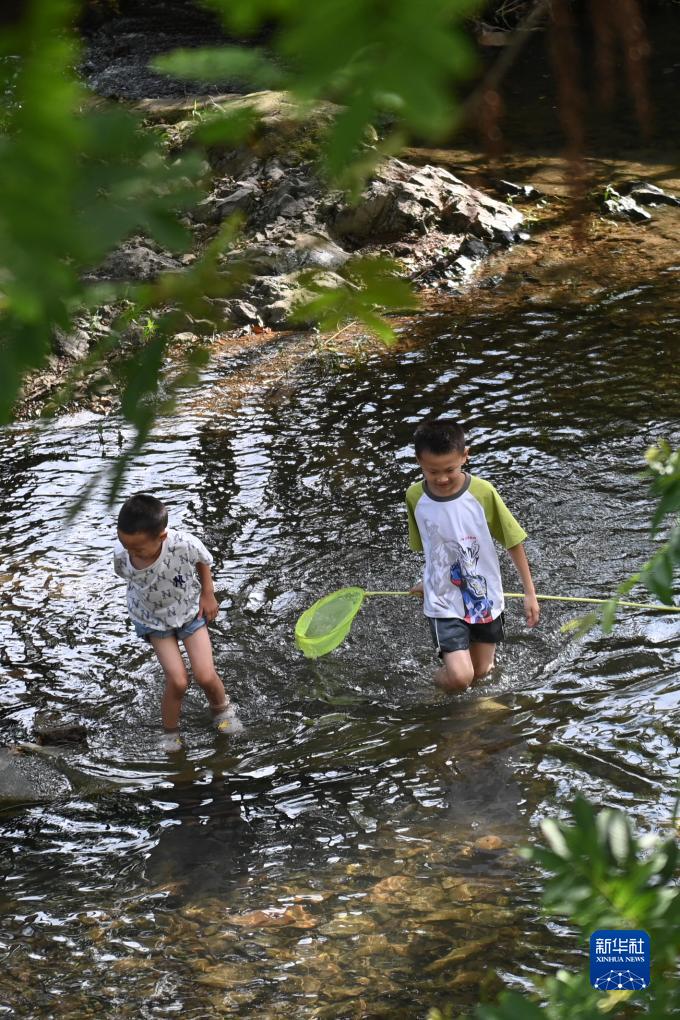 8月20日,小朋友在余姚市四明山鎮大岙村的溪水中游玩。