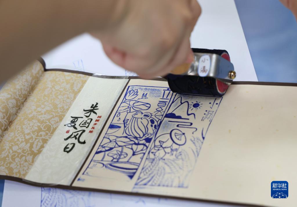 8月20日,在“朱夏國風日”傳統文化沉浸式體驗活動中,國家圖書館工作人員為孩子們制作國風卷軸。