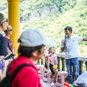馬選軍向從廣東來的游客介紹北盤江大橋和家鄉的變化(8月16日攝)。
