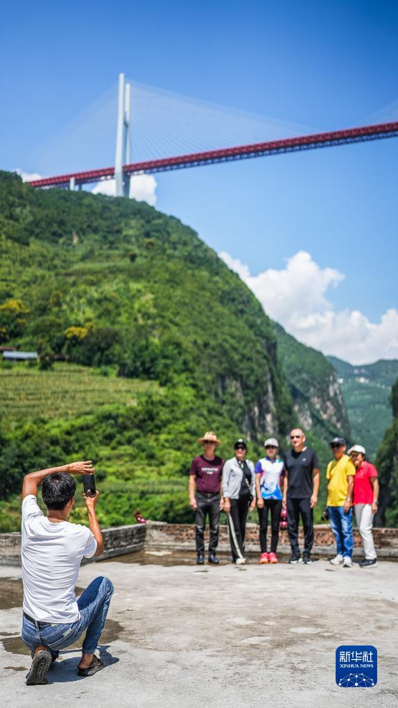 馬選軍幫從廣東來的游客拍攝合影(8月16日攝)。