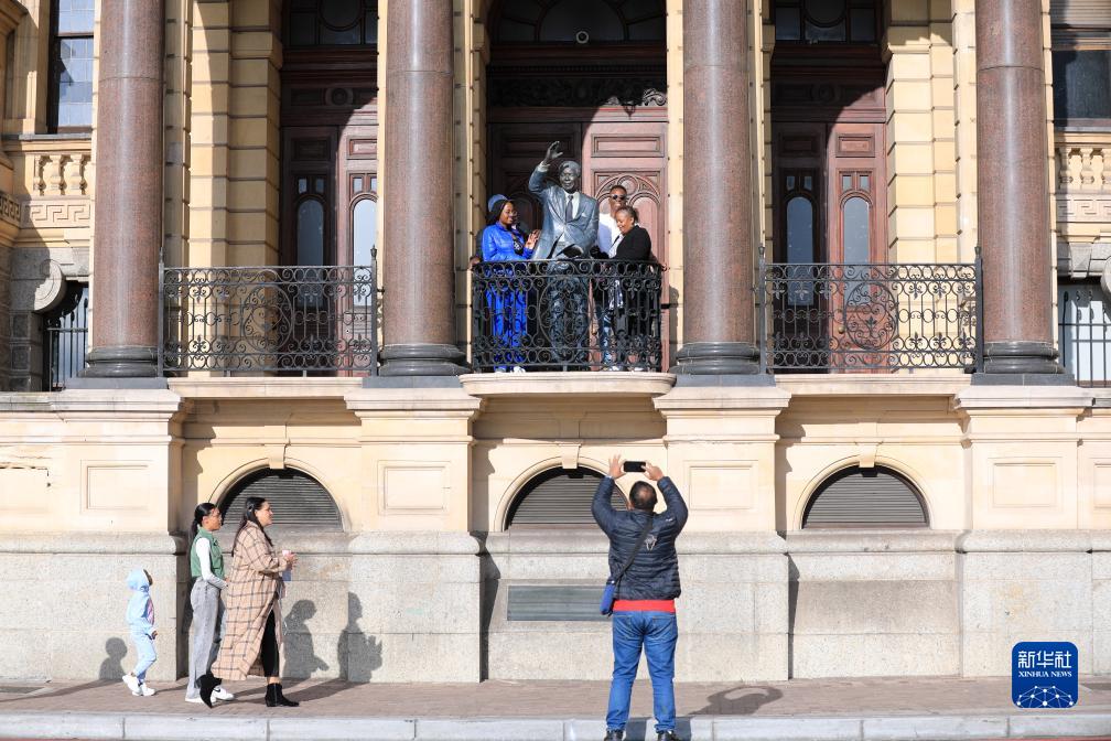 8月13日,游客在南非開普敦與曼德拉雕像合影。