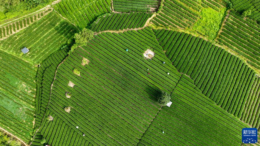 8月20日,茶農在貴州省遵義市湄潭縣永興鎮萬畝茶海采摘秋茶(無人機照片)。