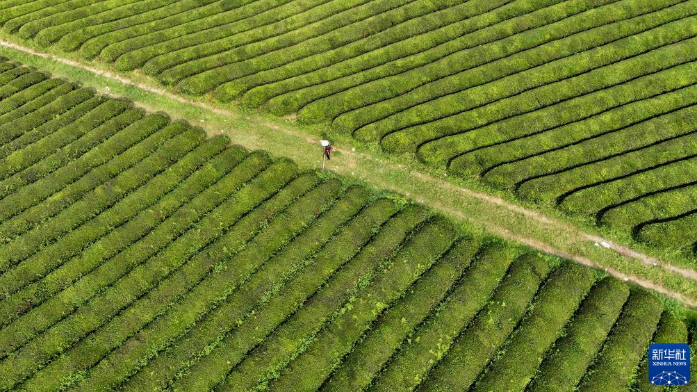 8月20日,茶農在貴州省遵義市湄潭縣永興鎮萬畝茶海管護茶園(無人機照片)。