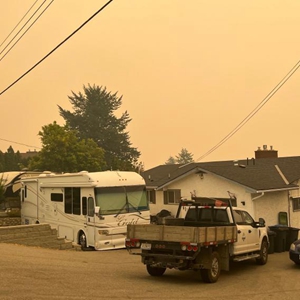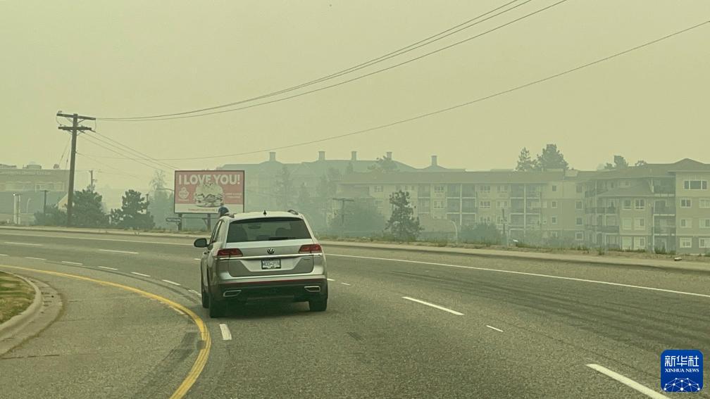 8月20日,在加拿大基洛納,車輛在野火煙霾籠罩中的道路上行駛。