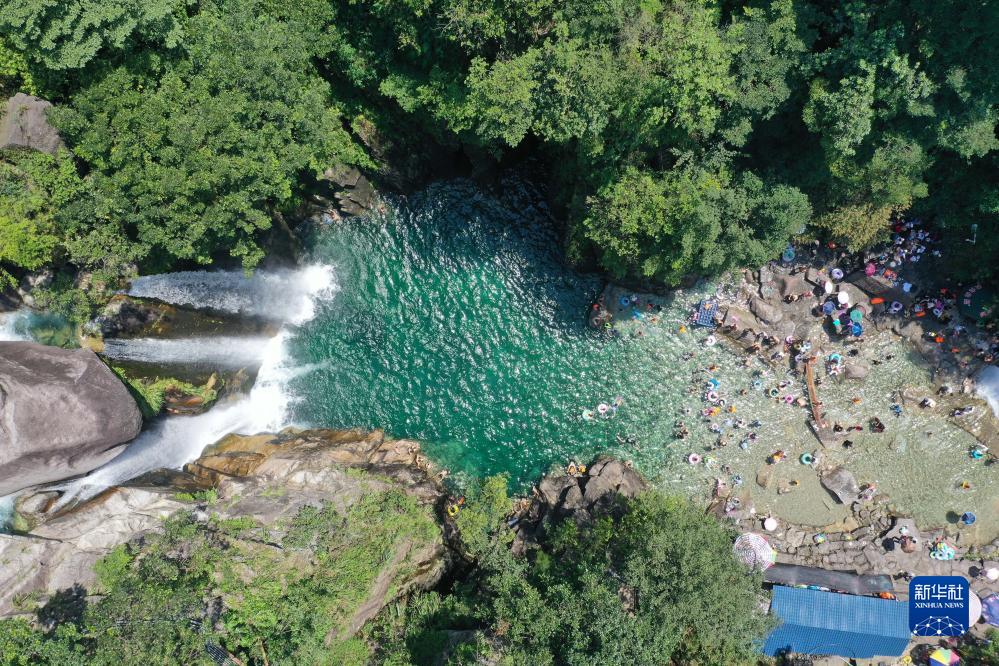 游客在融水苗族自治縣香粉鄉中坪村三友瀑布景區戲水消暑(8月19日攝,無人機照片)。近年來,中坪村充分利用粵桂協作幫扶資金,升級改造景區基礎設施,大力發展鄉村旅游產業。