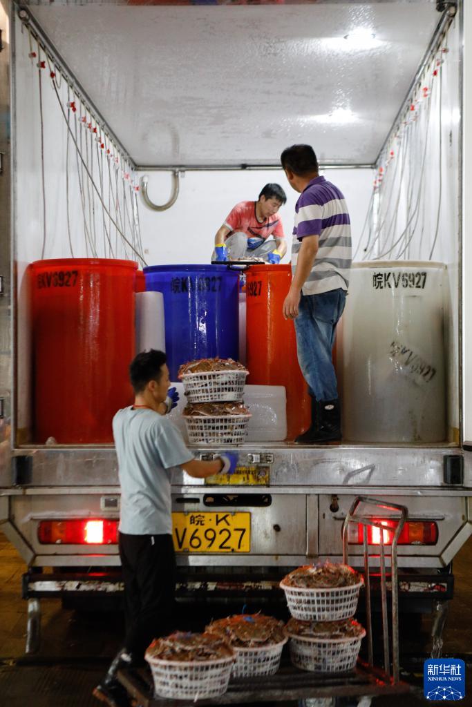 8月16日,在浙江省舟山市普陀區舟山國際水產城,工作人員將梭子蟹放在充氧水桶里。新華社記者 劉夢琪 攝