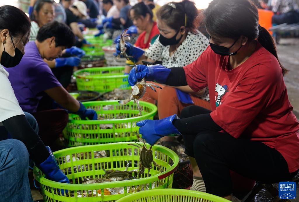 8月17日,在浙江省舟山市普陀區舟山國際水產城,工作人員按級分揀梭子蟹。新華社記者 韓傳號 攝