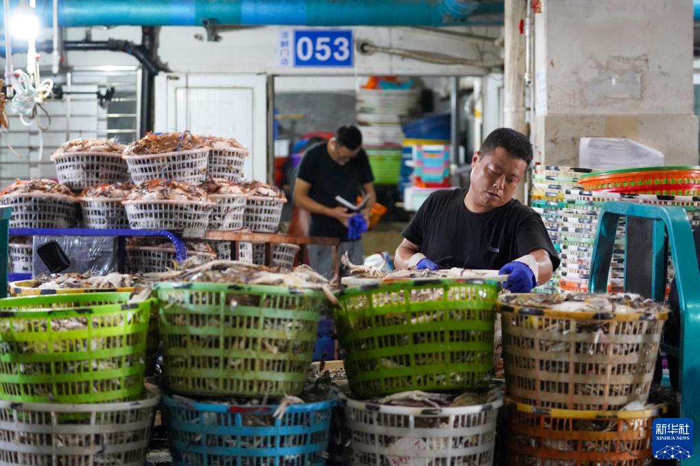 8月20日,在浙江省舟山市普陀區舟山國際水產城,工人將分揀好的梭子蟹裝車。新華社發(鄒訓永 攝)