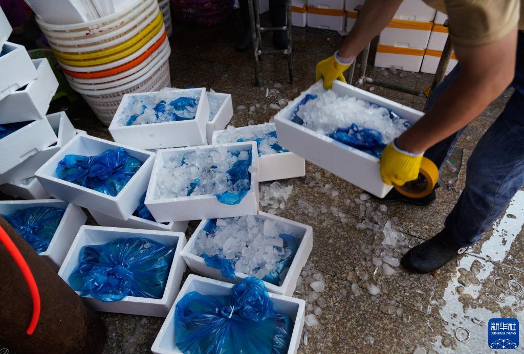 8月17日,加冰后的新鮮梭子蟹在浙江省舟山市普陀區舟山國際水產城等候打包。新華社記者 韓傳號 攝