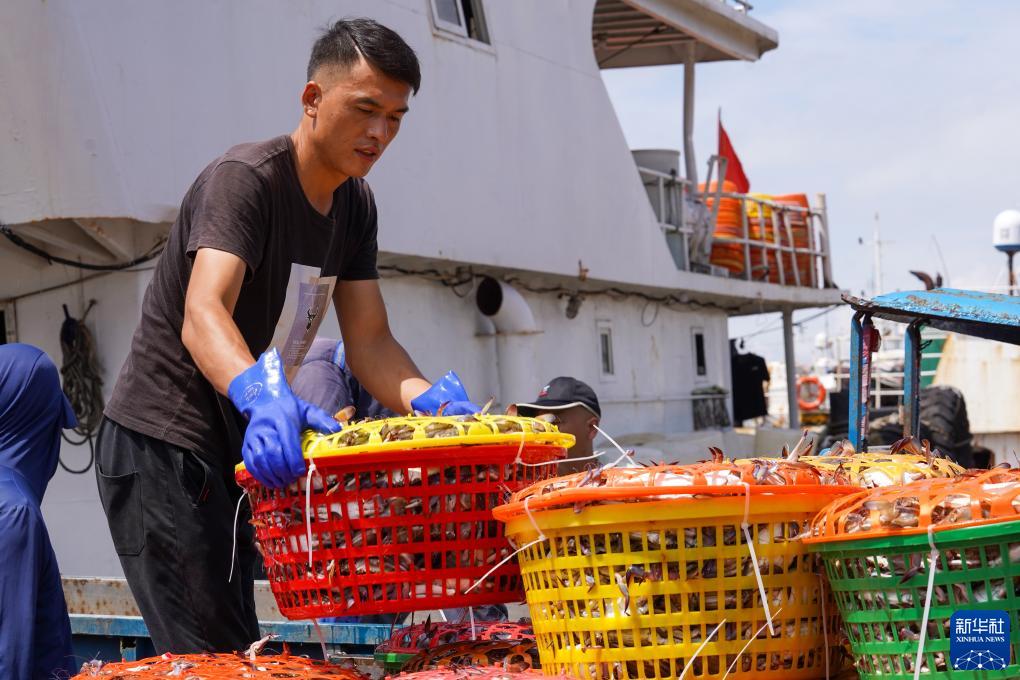 8月20日,船員在浙江省舟山市普陀區舟山國際水產城碼頭將一筐筐梭子蟹裝車。新華社發(鄒訓永 攝)