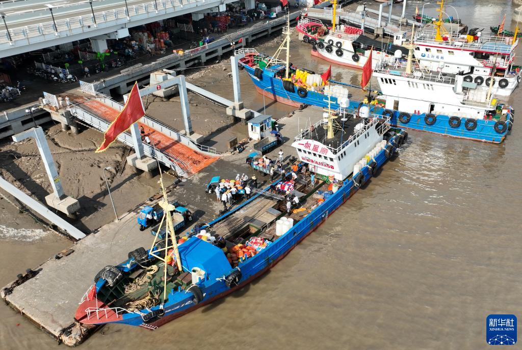 漁運船將新鮮梭子蟹運到浙江省舟山市普陀區舟山國際水產城碼頭(8月16日攝,無人機照片)。新華社發(胡錦 攝)