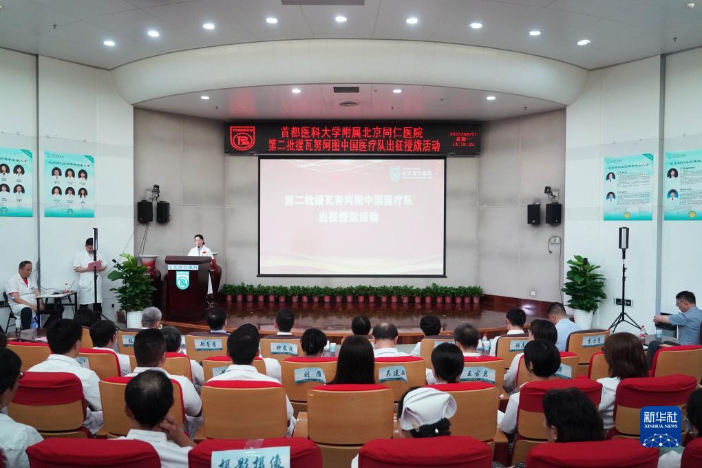 8月21日拍攝的北京同仁醫院第2批援瓦努阿圖中國醫療隊出征授旗活動現場。