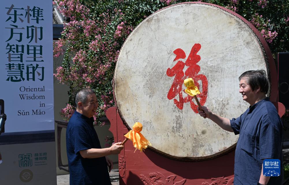 8月21日,京作硬木家具制作技藝國家級代表性傳承人種桂友(左)、明式家具制作技藝國家級代表性傳承人許建平共同為展覽擊鼓開幕。