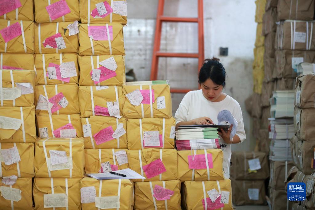 8月20日,工作人員在貴州省從江縣新華書店教材倉庫內清點登記新學期教材。