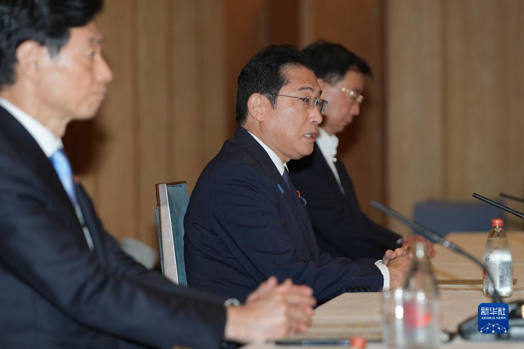 8月21日,在日本東京首相官邸,日本首相岸田文雄(中)在與日本全國漁業協會聯合會會長坂本雅信一行會見時發言。