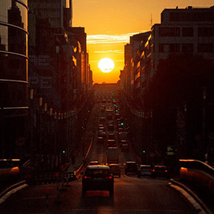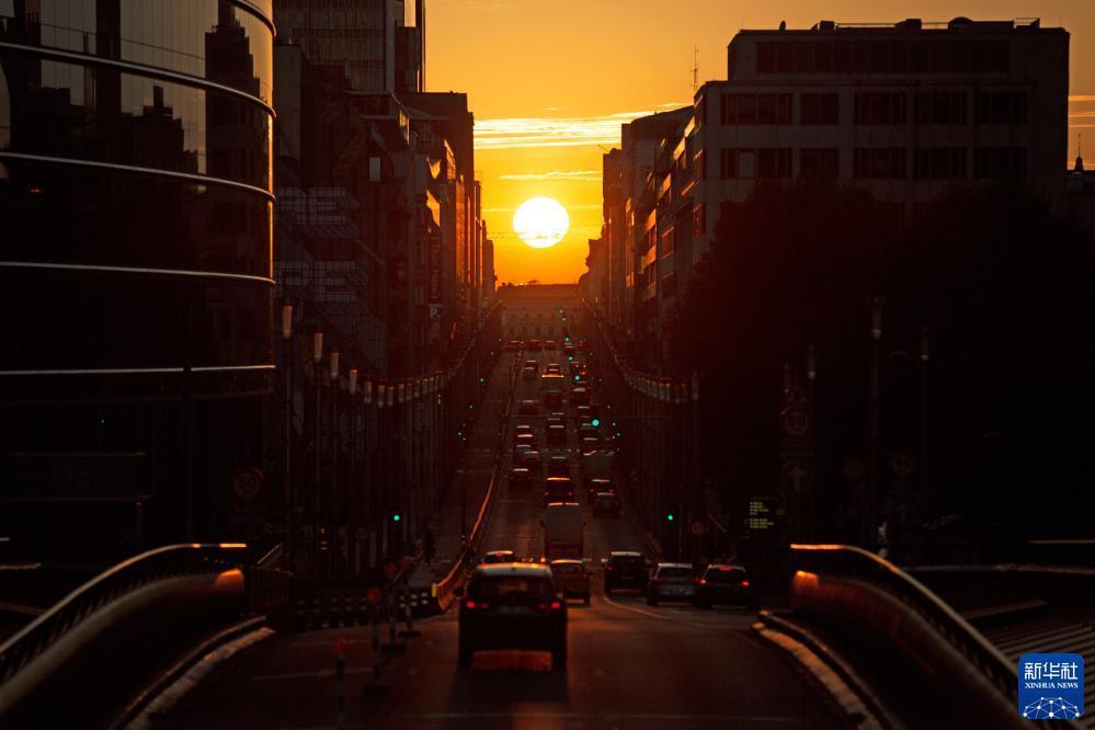 當日,在比利時首都布魯塞爾,夕陽從主干道法律大街上空緩緩落下,形成“懸日”景觀。