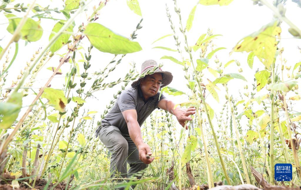 8月21日,在湖南省衡陽市衡東縣大浦鎮,當地村民在收割芝麻。