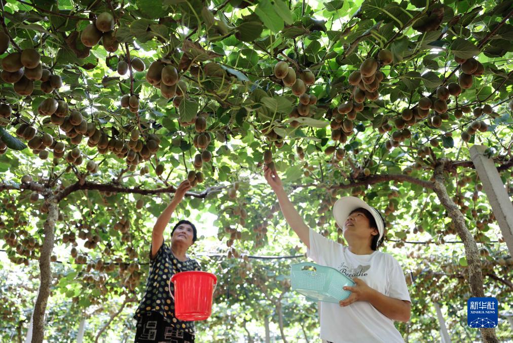 8月22日,在山東省臨沂市沂南縣銅井鎮大張莊村獼猴桃種植基地,農民在采摘獼猴桃。