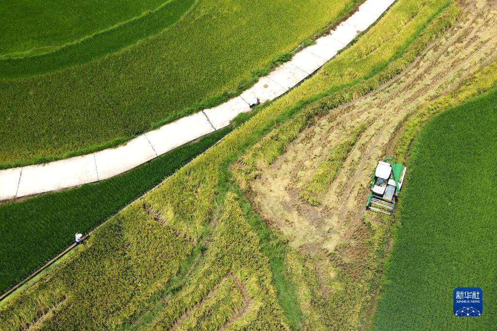 8月22日,在湖南省婁底市雙峰縣井字鎮花橋村,農民駕駛收割機收割稻谷(無人機照片)。
