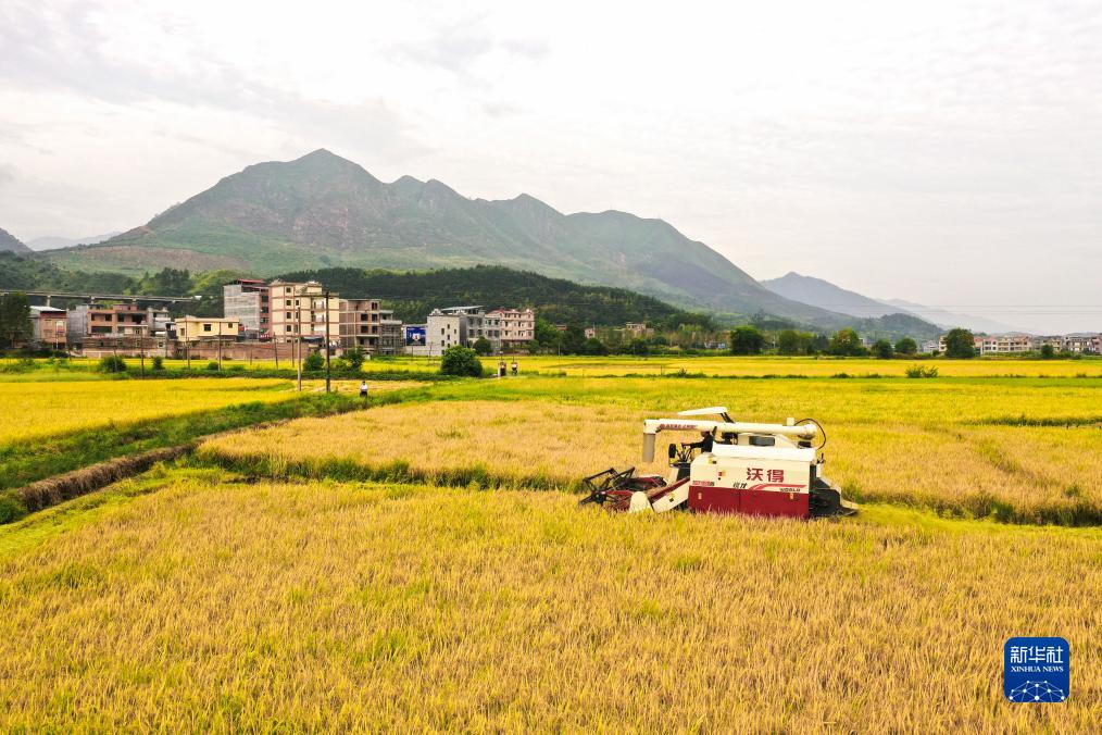 8月21日,湖南省常寧市廟前鎮泉井村農民駕駛農機在收獲水稻(無人機照片)。