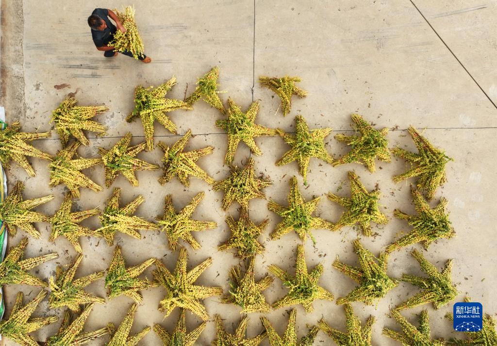8月21日,在湖南省衡陽市衡東縣大浦鎮,當地村民在晾曬芝麻(無人機照片)。