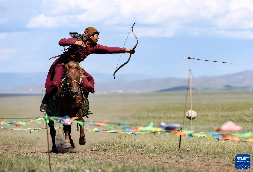 8月19日,在蒙古國泰吉山谷,選手在蒙古國“游牧民族”世界文化節上展示騎馬射箭。