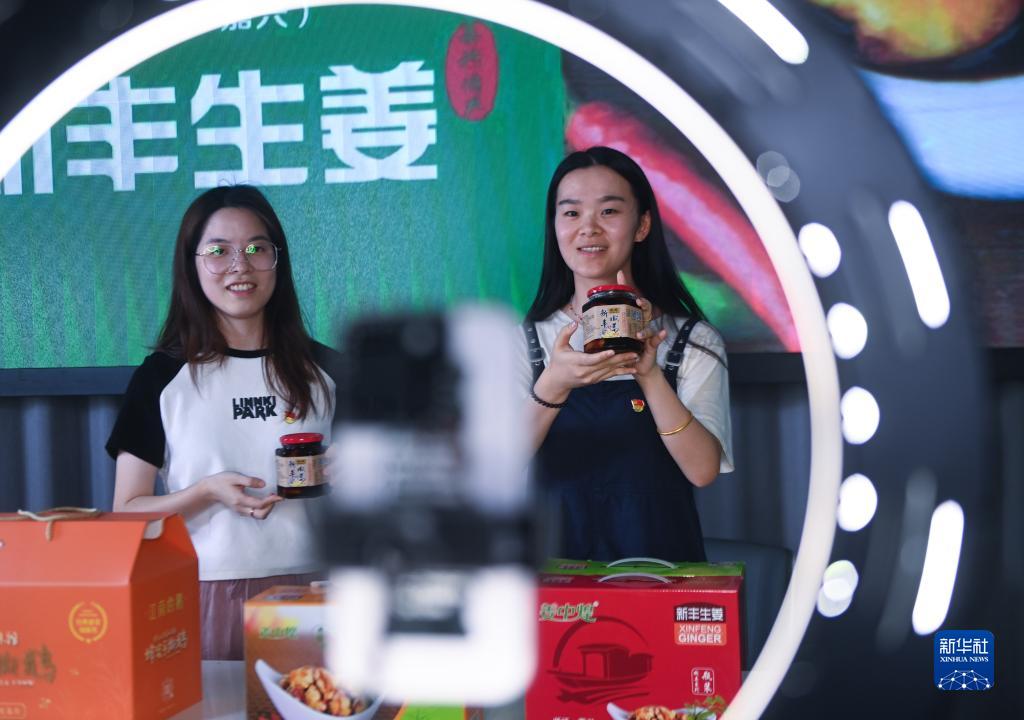 8月22日,黨員志愿者在嘉興市南湖區電商產業園的共富工坊直播間進行生姜助農直播銷售。