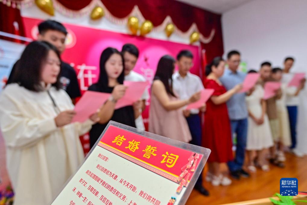 8月22日,新人在山東省青州市政務服務中心民政局婚姻登記處宣讀結婚誓詞。