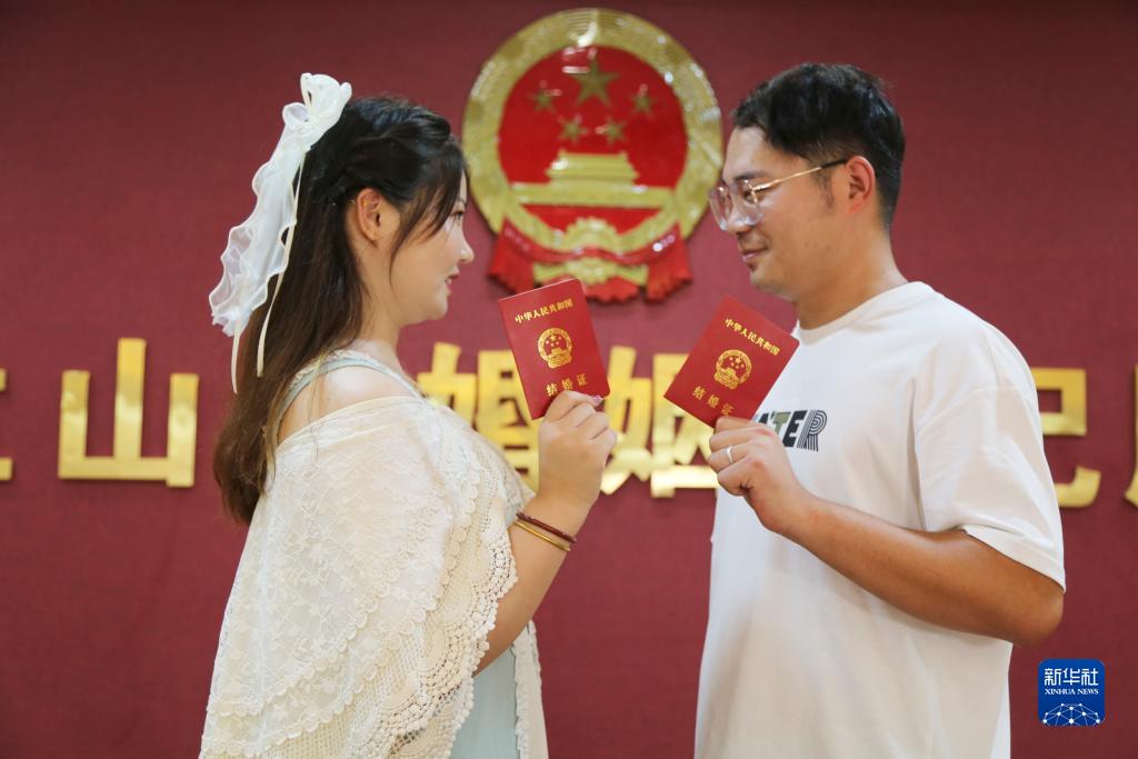 8月22日,在山東省臨沂市蘭山區婚姻登記處,新人在展示結婚證。