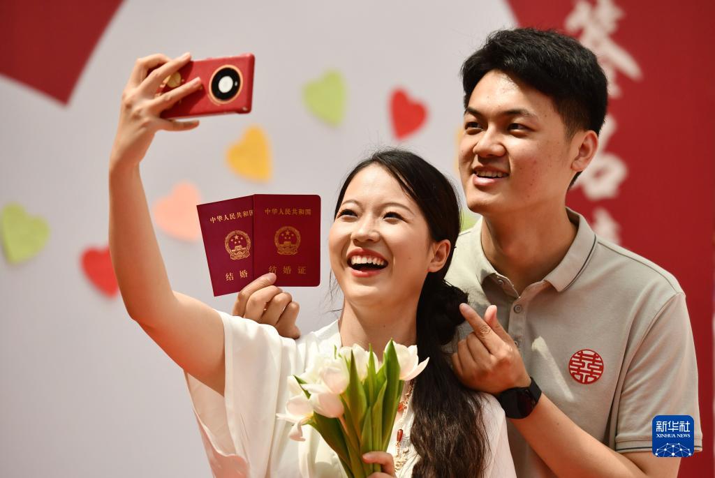8月22日,在安徽省阜陽市舉辦的“愛在七夕 美好阜陽幸福家”婚姻登記集體頒證暨“最美家庭”第一課活動現場,新人在拍照留影。