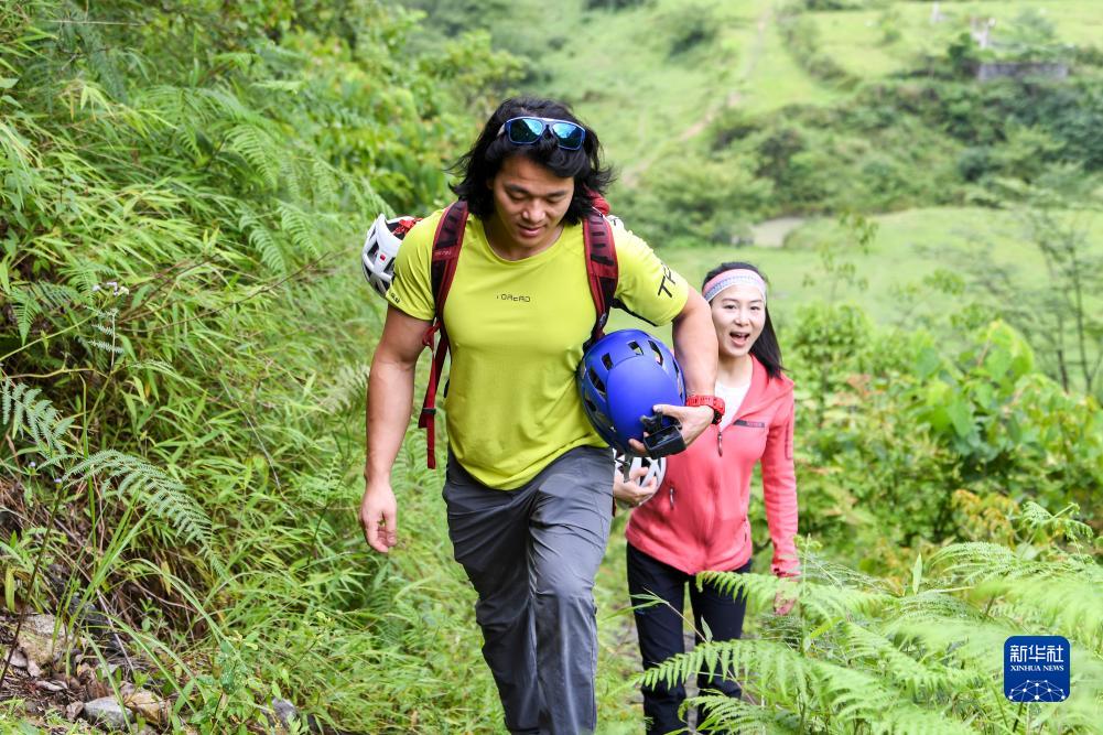劉永邦(左)和肖婷在查看攀巖線路(2021年6月26日攝)。