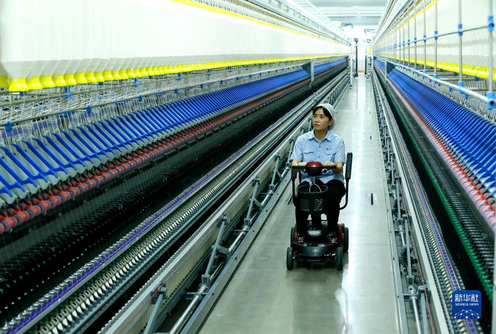 8月22日,青島即發盛寶紡織有限公司工人在數字化紡紗智能生產線上生產高端纖維。
