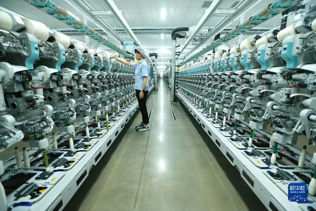 8月22日,青島即發盛寶紡織有限公司工人在數字化紡紗智能生產線上生產高端纖維。