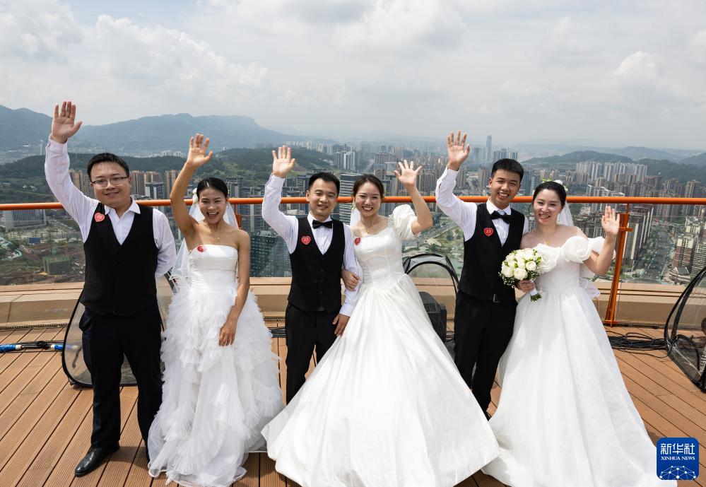 8月22日,參加集體婚禮的新人在三江新區“三江之眼”520觀景平臺合影留念。