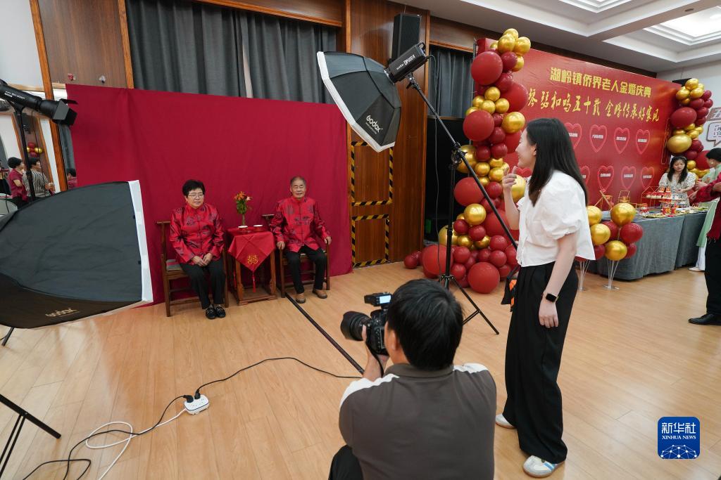 8月22日,在浙江省瑞安市湖嶺鎮綜合文化站,工作人員為金婚夫婦拍攝紀念照。