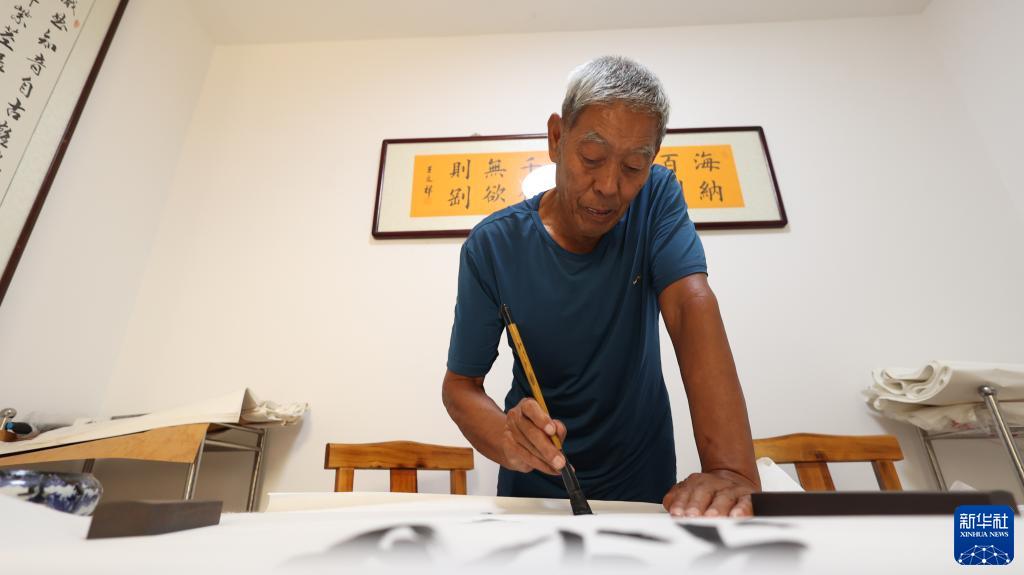 8月22日,老人在青縣曹寺鎮曹寺村的孝老食堂練習書法。