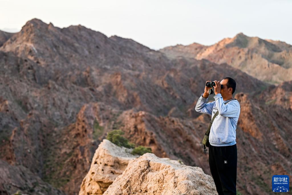 8月20日,董海寧利用望遠鏡觀察遠處長城情況。