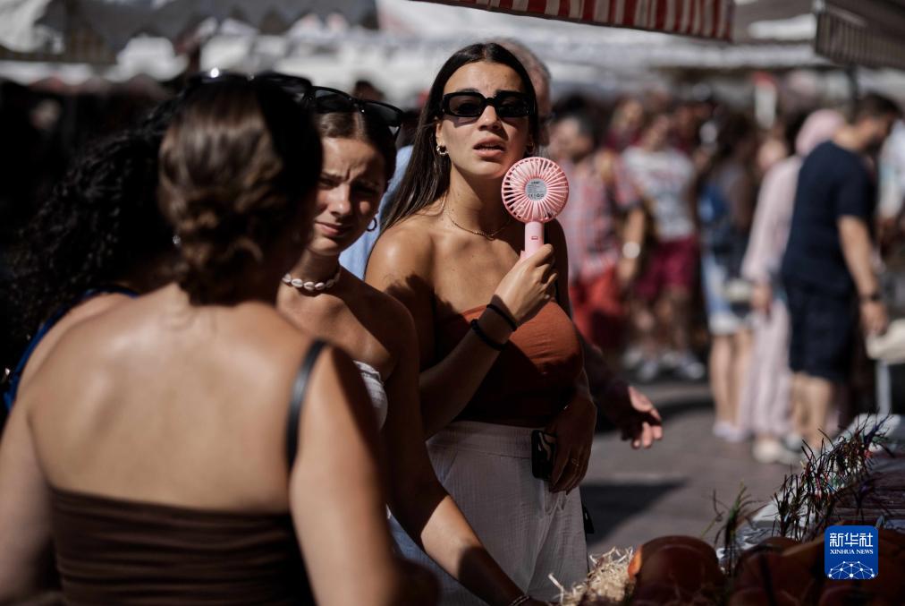 8月22日,在法國南部城市尼斯街頭,一名女子用小風扇降溫。